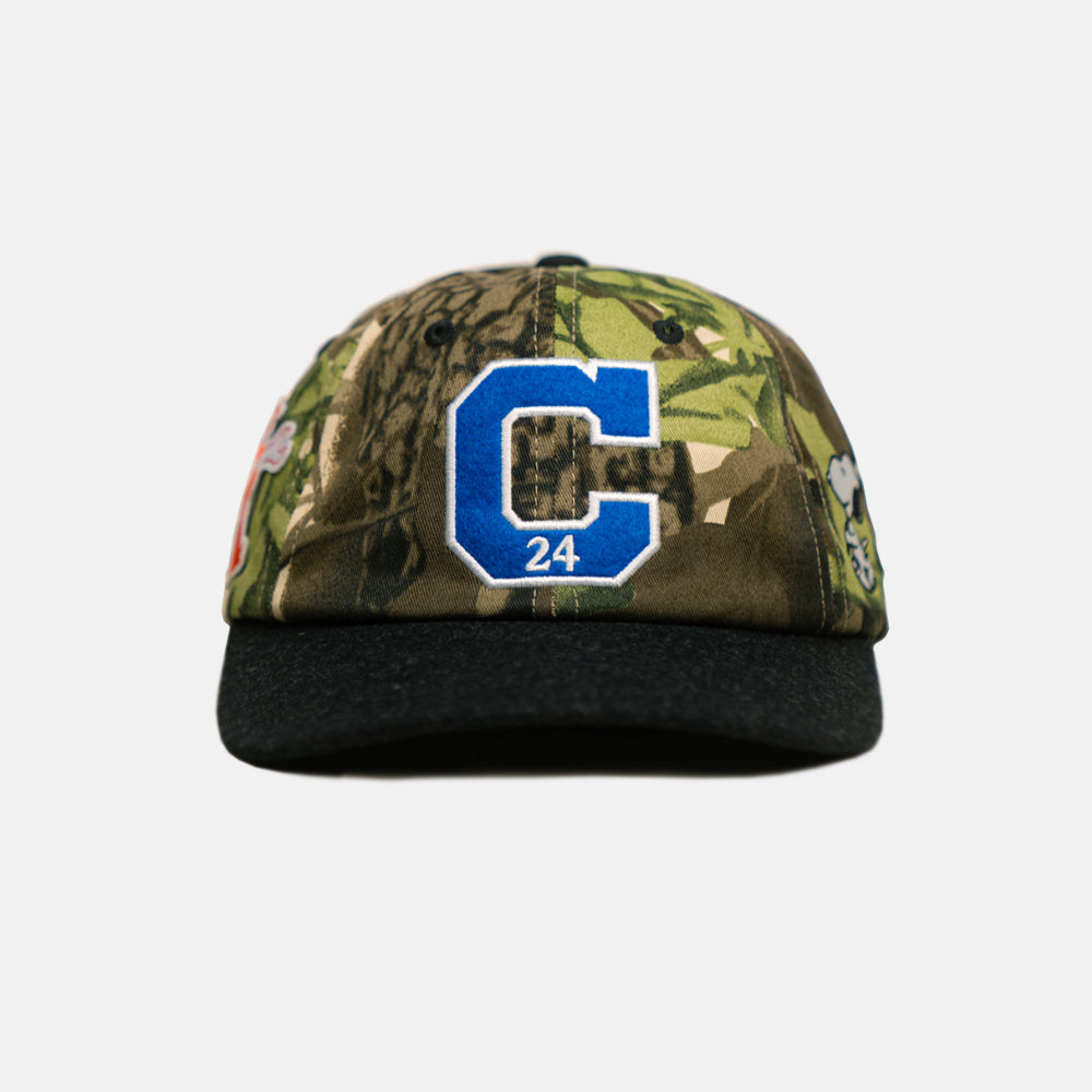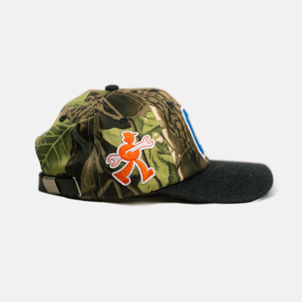 This camo cap was constructed from scratch, every single hat will be slightly different in its camouflage pattern. It includes a number of different Chromatic hits in a number of different materials. Applique , embroidery and screen printed seams on the interior.